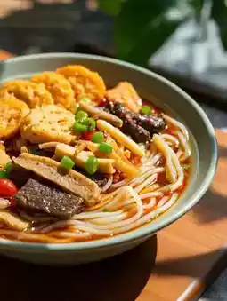 Lingshui: The Lingshui sour noodles are spicy and appetizing, with rich toppings like fish cakes, beef jerky, and peanut worms.