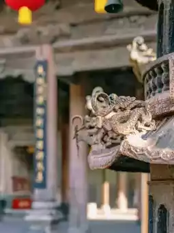 A prominent feature is the Autumn Wind Tower, named after the stele inscribed with Emperor Wu of Han's "Autumn Wind Ode." This magnificent three-story, cross-shaped, hip-and-gable roofed structure houses the unique Pin-shaped Opera Stage. The "three carvings" art (wood carving/stone carving/colored glaze) is also exceptional.