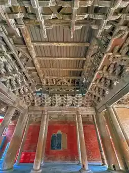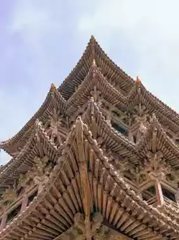 Standing 23.19m tall, Feiyun Building features a three-story exterior with a hidden two-story interior, topped with a cross-gabled hip-and-gable roof. Remarkably, the entire structure is built without a single nail, relying solely on intricate mortise and tenon joints. Inside, four towering golden pillars reach the top floor, surrounded by densely packed brackets shaped like clustered clouds, hence the name "Feiyun Building" (Flying Cloud Building). Its upturned eaves, glazed tile roof, and gleaming appearance under the sunlight make it a true masterpiece of ancient architecture.