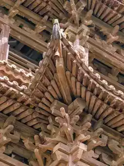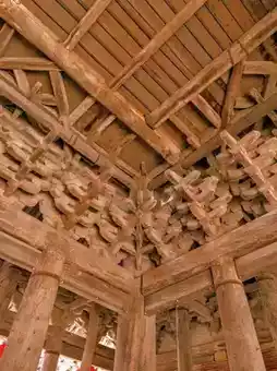 Standing at 23.19 meters tall, Feiyun Tower features a unique "three visible, five hidden" layered structure, topped with a cross-hipped roof. Remarkably, the entire structure was built without a single nail, relying solely on intricate mortise and tenon joints. Four towering golden pillars rise from the base to the top floor, surrounded by densely packed brackets that resemble swirling clouds, giving the tower its name, "Feiyun" (Flying Cloud).