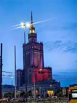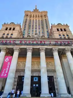 Poland's [Palace of Science and Culture] is located on the west side of Warsaw's Parade Square. It was built from 1952 to 1955 by Soviet laborers as a gift from Stalin to the Polish nation. The Palace of Science and Culture Pałac Kultury i Nauki is usually abbreviated as PKiN, and many Warsaw citizens also jokingly call it Stalin's syringe and Russian wedding cake. It is 234 meters (767 feet) high and has 3,288 rooms, 3 theaters, 1 swimming pool, 1 museum and a conference hall that can accommodate 3,000 people. This cultural palace was completed in just three years and is built in the Stalinist style. It is now used to hold various types of fairs, exhibitions, art performances and music events.