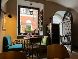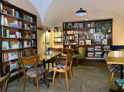 The walls are lined with books, making it feel like you're sitting in a small study.