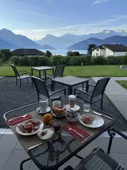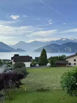 Wake up to the crisp, refreshing air and gaze out at the snowy mountain peaks contrasting with the crystal-clear waters of Lake Lucerne, as if stepping into a real-life postcard. 🌤️