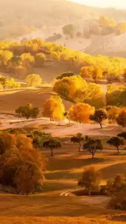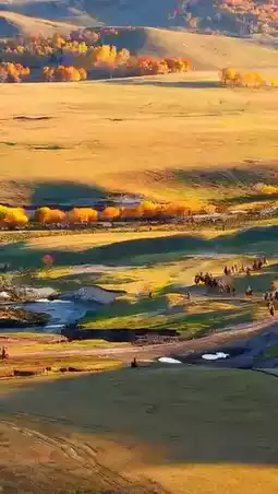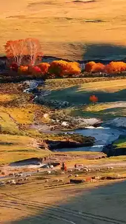 · 🐴 Morning: Frog Dam (a hidden gem for photographers, golden white birch forest, scattered haystacks, and shepherds herding sheep in autumn, like a stunning oil painting)