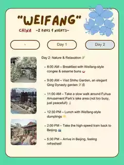 • 7:00 AM – Take the high-speed train from Beijing to Weifang 🚄 (3.5 hours)