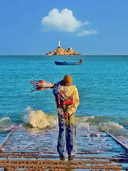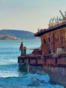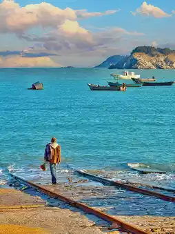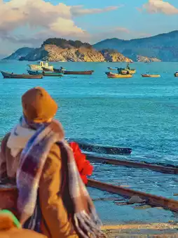 There are fishing boats 🚢 and mountains ⛰️ in the distance