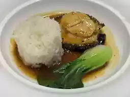 Make sure to eat well before hiking: First, take a taxi to the mountain-top restaurant 'Weihai Impressions' to fill your stomach. I ordered a 6-head black gold abalone rice for 35 RMB, which includes six heads of abalone and truffle rice. Additionally, I ordered local snacks like red sugar crispy buns and stir-fried cauliflower with dried chili! The total bill was around 80 RMB.