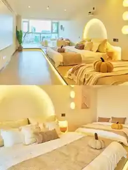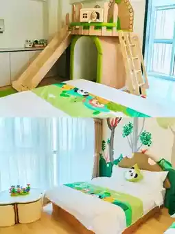The room features an awesome slide that goes straight from the bed—kids can play all day! Next to it is a huge floor-to-ceiling window where you can lie down and enjoy the sunrise over the sea and the night lights. The view is as beautiful as a painting!
