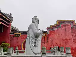In the drizzle, I saw the statue of Confucius standing solemnly against the red wall, making people admire and yearn for it.