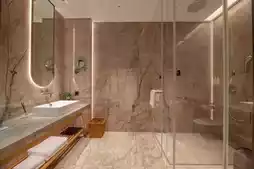Upon entering, curtains slowly open, and the intelligent voice system in the room is very convenient, meeting modern lifestyle demands. The fresh green color typical of Fangcaodi is the highlight of the room, with sofas, tables and chairs, floor-to-ceiling windows, and dry-wet separated bathrooms all arranged comfortably. The extra-large floor-to-ceiling windows let you see the scenery as soon as you wake up. PS: The hotel provides children's amenities; please call the front desk if needed, and staff will deliver them.