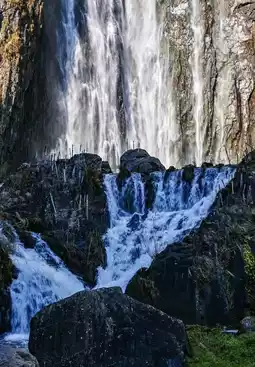[Valley Bottom Looking Up]: Look up at the hundred-meter white ribbon falling through the air, splashing like piles of snow, mist hitting your face, soul-stirring!