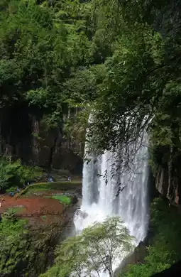 [Baizhang Second Tier]: Smaller drop but elegant shape, hanging like a curtain between green cliffs, surrounded by lush vegetation