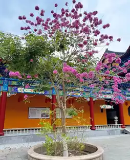 The temple's courtyard is serene and peaceful, with ancient cypress trees towering and flowers and plants flourishing. As the breeze blows, the leaves rustle, as if whispering the wisdom of Buddhism.