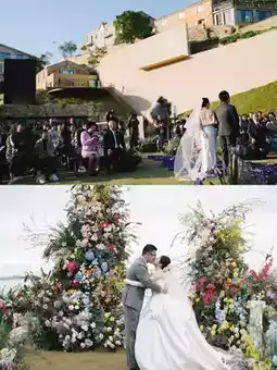If you prefer openness, the thousand-foot lawn is perfect, dotted with autumn wildflowers, linen tablecloths spread on the grass, and autumn sunlight breaking through the clouds shining on the white veil💐 The wind rustles the grass leaves softly, like nature singing the prelude to the wedding.