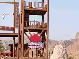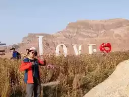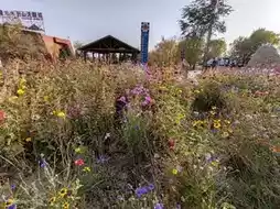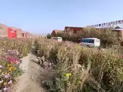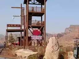 Against the magnificent backdrop of the red bed formations of the Wensu Grand Canyon, the area near the visitor center comes alive with vibrant scenery. Vast fields of wildflowers bloom in a riot of colors, predominantly pink, yellow, and blue, resembling a stunning welcome carpet. Wooden viewing platforms and pavilions are scattered throughout, creating a gentle contrast with the distant red mountains. The oversized "LOVE" art installation, adorned with Chinese elements, adds a modern and lively touch to this floral sea at the edge of the desert, guiding visitors as they embark on their journey to explore the canyon.