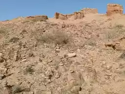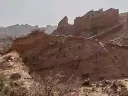 A vast and majestic Danxia landscape unfolds, where ochre-red ravines and cliffs dominate the view. A winding wooden boardwork climbs through this rugged terrain, carving a path for visitors to explore its natural wonders. Barren slopes are dotted with sparse shrubs, while the ground is scattered with countless stacked stone cairns—quiet testaments to human presence within the desolation. In the distance, layered mountain ridges fade into the haze, embodying the profound mystery of the deep Gobi.