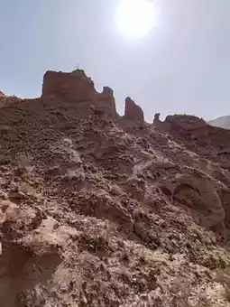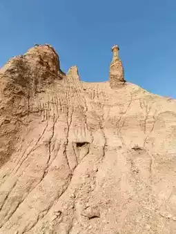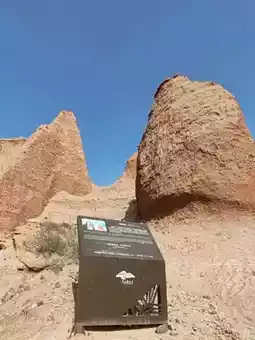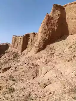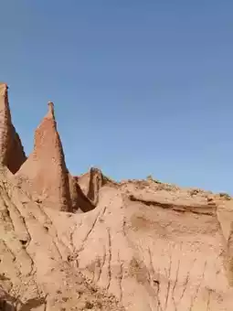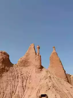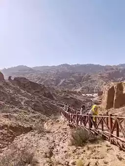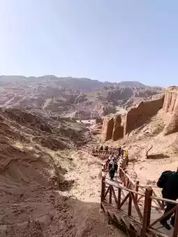 This landscape is defined by sheer cliffs and unique mushroom-shaped stone columns, embodying the raw, powerful geology of the northwest—both desolate and magnificent. Against the blue sky, the vibrant red rock formations contrast poetically with the yellow earth, resembling a natural ink-wash painting. Visitors can follow the boardwalk that weaves through the area, experiencing up close the artistry of nature’s hand.