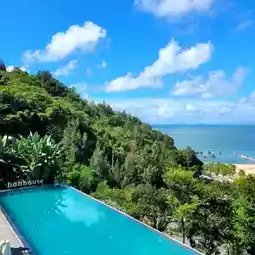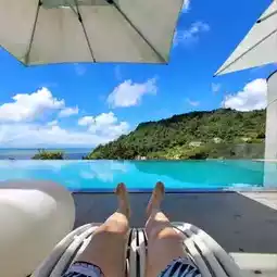 Despite being perched on a mountain, the hotel offered frequent, free buggy service, making transportation convenient. The facilities were also excellent. The cafe offered a relaxing time with a stunning view, and the food at the restaurant was excellent. The infinity pool was particularly impressive. The view from the pool was the highlight of my trip.