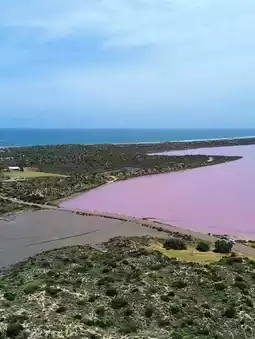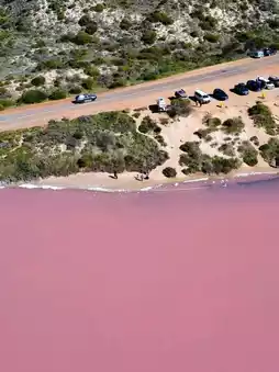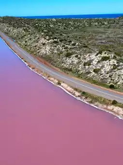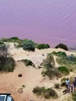 #holidayitinerary The Pink Lake at Port Gregory is such a fun and weird little stop. The color is super bright when the sun's out, like a giant strawberry milkshake. It's caused by some kind of algae and salt combo, and the shade changes depending on the time of day and weather. We went late morning and it was seriously glowing.