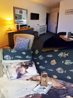 After checking in, the room's layout is truly impressive. The oversized floor-to-ceiling windows seamlessly connect us to the sea, allowing us to admire the rippling blue waves outside.