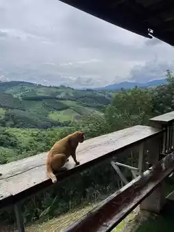 Enjoy a drink amidst mountain views, cool breezes, and a super chill atmosphere with your adorable cat.