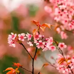 🌸 Along the way, cherry blossoms bloom across the mountain range, their sweet pink contrasting with the sky and lush green leaves, creating a truly romantic and natural atmosphere.