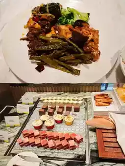 The breakfast is quite extensive, offering four or five kinds of fresh juices and freshly baked waffles, which is satisfying. The lounge dining was initially excellent, with generous portions of meat and vegetables. The sliced cakes among the desserts were comparable to those from professional cake shops. Recently, however, there have been some cutbacks, and the sliced cakes are hard to find, which is a bit disappointing. The drinks selection is basic but acceptable.