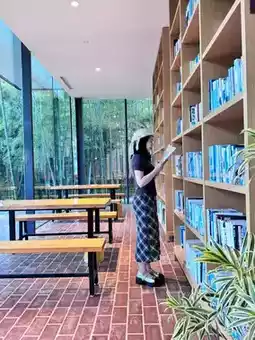 The library at the reception center is perfect for lounging in a chair all afternoon with bamboo forests just outside the window. Take a few photos for that artistic vibe. Haha! There's also an eco-restaurant serving freshly picked seasonal fruits and vegetables 🥬. The portions are generous and delicious—my kid loves it! At the entrance, there's a colorful little train 🚞 that children love. My daughter keeps talking about wanting to ride it!