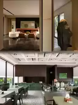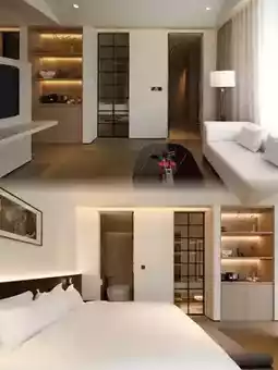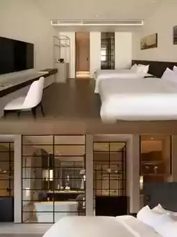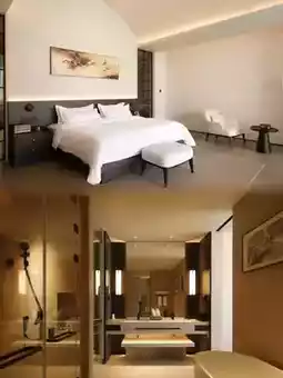 The suite you will stay in is equipped with 270° panoramic floor-to-ceiling windows, and the tatami tea table faces the misty Ganlu Mountain. It has its own private courtyard surrounded by bamboo forests, and a bluestone path connects to the outdoor hot tub. The rooms are equipped with standard floor heating and smart home systems. The bath products are from a niche naturalistic brand, and the bathrobes are decorated with Yangxin cloth stickers, a Hubei intangible cultural heritage craft.