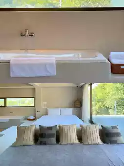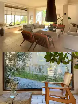 This homestay is surrounded by rural fields, featuring a sleek, minimalist design with natural tones—earthy grays and warm yellow lighting, creating a serene and cozy vibe!!! The first-floor common area has floor-to-ceiling windows on three sides, and when the afternoon sun streams in, the play of light and shadows feels magical!!!
