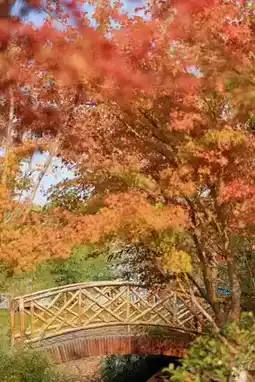 An ancient bamboo bridge and a small courtyard full of red maples, very quiet with few people, perfect for portrait photography.