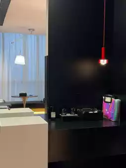 ▪️The hotel is a Bauhaus art container hidden in the bustling city, with a black, white, and gray base clashing with vermilion and emerald green accents.