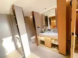 The bathroom features a separate wet and dry design, and the shower area is equipped with high-end shower facilities with multiple water outlet modes for a comfortable shower experience. The bathroom also includes brand-name toiletries, soft towels, and bathrobes to provide guests with attentive service.