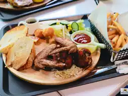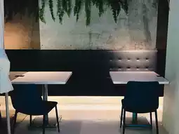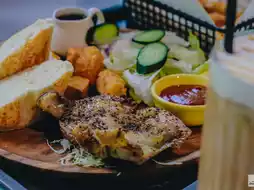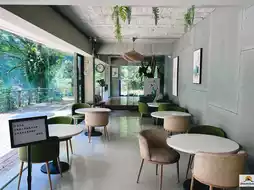 The cafe's decor is simple yet minimalist, using wood tones and clear glass, allowing plenty of natural light. A highlight is the streamside terrace, offering views of the mountains and the clear water. 🏞️ They offer a variety of food, desserts, and drinks.