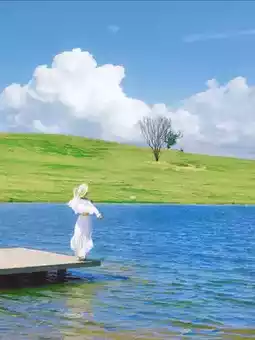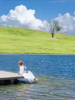 A solitary tree quietly stands on the hilltop, with rolling mountains in the distance, a vast green lawn and a blue lake nearby—perfect for camping and watching the sunset. With such a great place, who needs to go abroad?