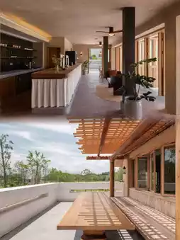 The Yongguichuan·Wuning West Lake Resort features a low-density decentralized layout, with multiple buildings artfully nestled among the mountains and waters. The facades use local stone and wood materials in earthy gray-brown tones, making the structures appear to grow naturally from the land.