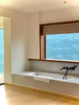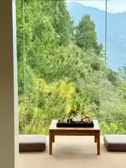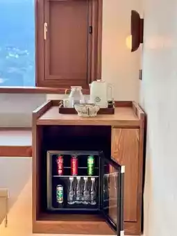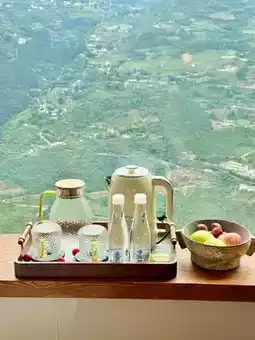 The room is very comfortable, with modern decor. It not only has an indoor soaking tub but also a glass-sealed tea room with floor-to-ceiling windows for tea drinking and an open terrace. Looking out, the view of Wenfeng Scenic Area is fully in sight, with the green river right in front of us. The beautiful scenery of Wushan Little Three Gorges is truly stunning!