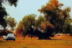 The trunk twists into a time tunnel, sunlight filters through the branches,