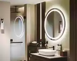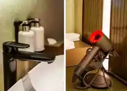 The bathroom area continues the high configuration, with Hansgrohe faucets, full-line MALIN+GOETZ toiletries, and even a Dyson hair dryer. Is this really a basic room?