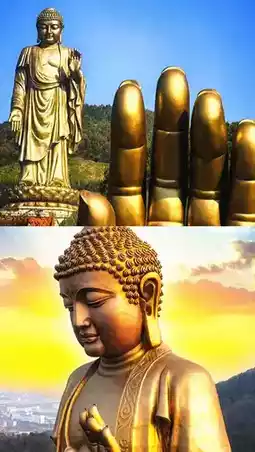The warm and warm sun shines on the majestic Buddha statue, shining brightly