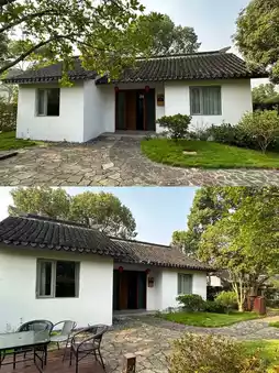 Rooms are spacious and clean, with floor-to-ceiling windows overlooking greenery—healing and relaxing