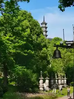 The first thing you'll see is Zhenlan Bridge. Next to the bridge is an ancient tree called Camphor Tree Mother, and in the distance is the Seven Buddhas Pagoda.