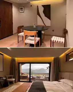 With 50 rooms, the courtyard king rooms offer bamboo grove breezes at the window, while loft-style rooms are perfect for late-night chats by the fireplace. Private villas cater to family gatherings. Inside, Kohler fixtures, smart toilets, five-star bedding, and laser projection screens elevate comfort. Expansive viewing terraces serve as personal "sky canvases"—sunrise at dawn, tea at dusk, and mountain winds brushing past, delivering undeniable serenity.