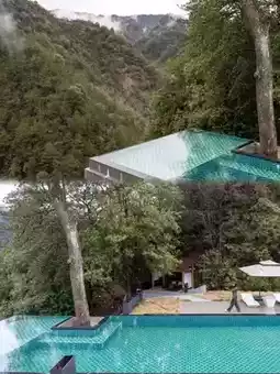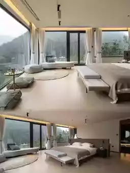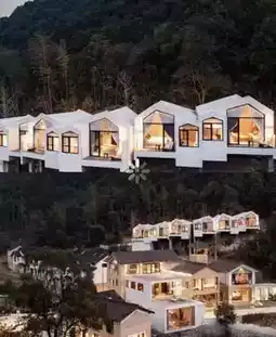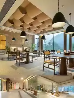 Staying on the cliff, surrounded by dense trees, the environment is quiet and secluded, as if isolated from the world. It features elements of Jiangnan water town with white walls and black tiles, as well as the rustic charm of traditional rammed earth houses. The room has extra-large floor-to-ceiling windows, and opening them reveals a view where the continuous mountain ranges seem within reach.