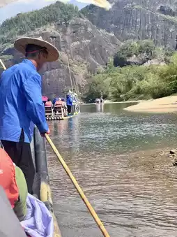 On the first day, I headed straight to the core scenic area to climb Tianyou Peak. While there were quite a few climbers due to the peak season, the numerous viewing pavilions along the way provided perfect spots to rest. Standing in one of the pavilions and looking down, the Jiuqu Stream appeared like a green silk ribbon winding around the verdant mountains. The breathtaking beauty of our country's magnificent landscapes is something you truly have to see to believe! The bamboo raft experience in the afternoon was the highlight of the trip. I specifically chose the 2 PM slot, and the sunlight filtering through the bamboo forest onto the water was mesmerizing. The raft guide leisurely narrated the legends of the stream. Without having to walk, I could simply lie back and enjoy the scenery of the mountains and water, with even the bustling crowd adding a touch of liveliness.