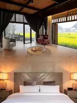 Hidden among the mountains and rivers in Wuyuan's small ancient village, there is a homestay converted from an abandoned oil press factory. It was built in the Southern Song Dynasty. The beautiful natural scenery and ancient cultural atmosphere are intertwined to form a unique "Qingpu style". The homestay retains the old building, some of the original walls and wooden structures.