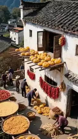 - Huangling’s Sun-Drying Autumn: Colorful crops on rooftops—a quintessential Chinese aesthetic.