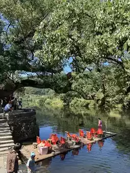 Filming location of the movie "I Am Not Pan Jinlian." The big camphor tree at the village entrance is a popular photo spot. You can ride a bamboo raft under the tree for 30 yuan per person, buy tickets on-site, and go immediately. Another must-visit spot in the village is the guesthouse where we stayed the night before, Mingxun Bieyuan · Yunshuiyao. I’ll write a separate post about it—it's a century-old house, and if you have the budget, definitely stay a night.