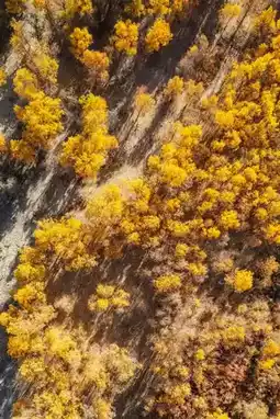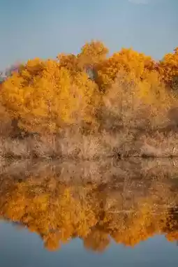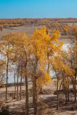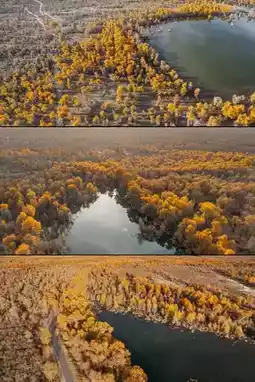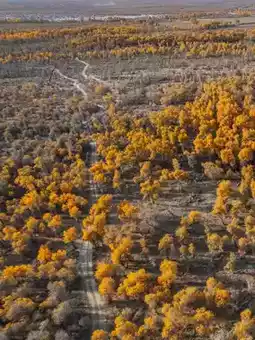 Keep going, where silver-white poplar skeletons and golden living trees form a duet of life. As the sun tilts westward, the golden poplars cast long shadows on the vast land. Flying a drone at this time, you will see a stunning desert poplar oil painting.