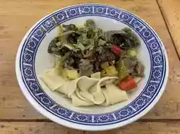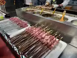 There are many food stalls lined up, and it is crowded with many tourists. A must-try is Xi'an specialty Biang Biang noodles. Flat noodles are eaten by mixing ingredients. Spicy lamb skewers are also delicious.